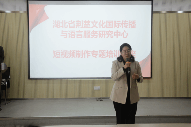 培训开始前,李金云介绍主讲嘉宾并作动员讲话。她指出,短视频宣传工作要兼顾文化传承与学院品牌推广,希望老师们、同学们通过本次培训提升短视频创作能力,用更鲜活的方式讲述荆楚故事、传播荆楚文化。