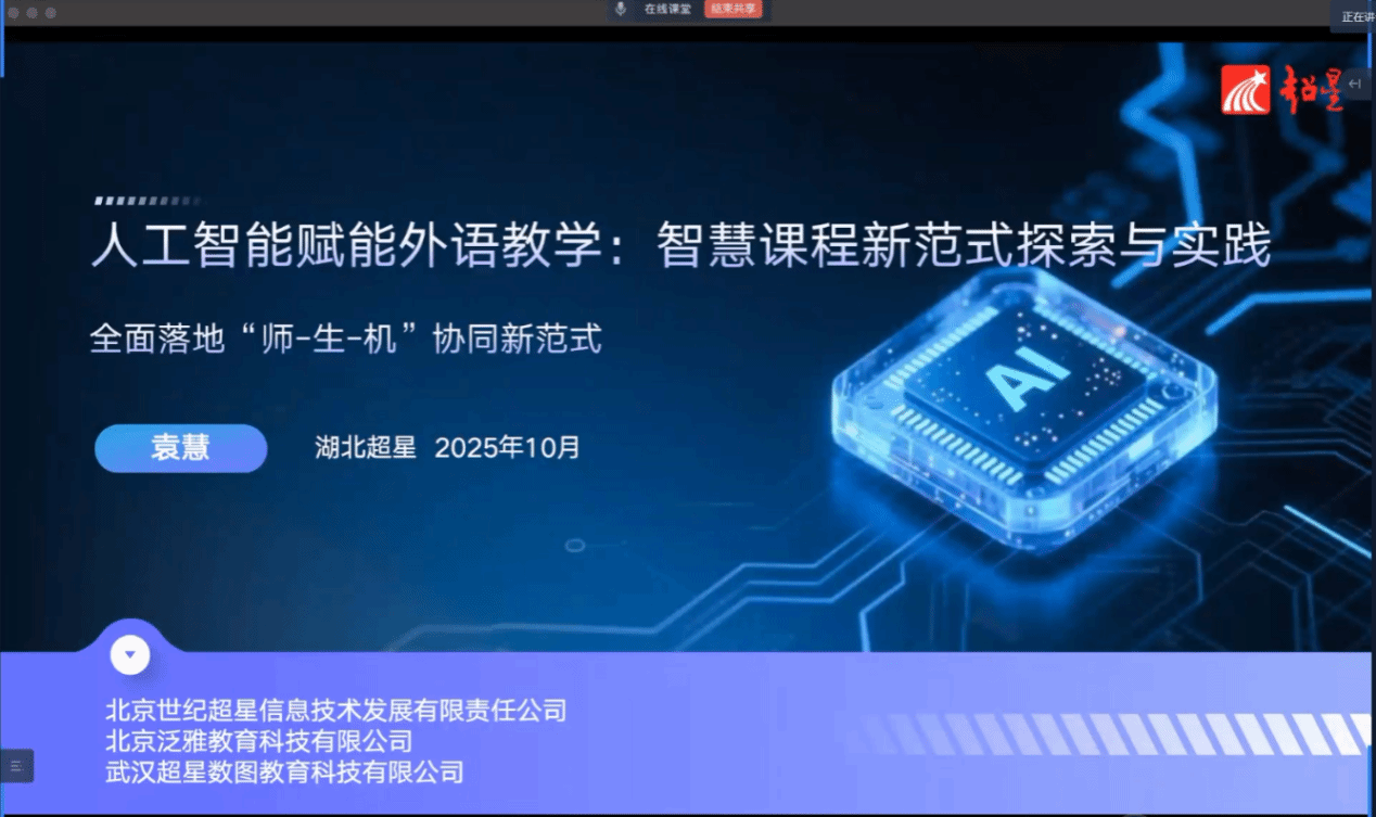 本网讯(通讯员 陈尧)10月13日,外国语学院联合武汉超星数图教育科技有限公司成功举办“人工智能赋能外语教学:智慧课程新范式探索与实践”专题线上培训。培训旨在贯彻落实教育部《关于加快推进教育数字化的意见》精神,推动人工智能与外语教学深度融合,提升教师数字素养与教学创新能力。院长李金云、各系部主任、骨干教师等50余人参加培训,副院长陈尧主持培训。
