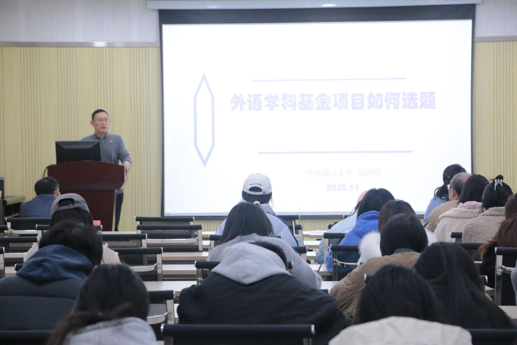武科大网讯(通讯员孙盼盼 姚刚)为助力外国语学院师生精准把握外语学科基金项目申报方向,11月28日下午16:00,我院特别邀请中国海洋大学杨连瑞教授在学院42305报告厅作了题为“外语学科基金项目如何选题”的专题讲座。院长李金云、副院长龙在波、MTI教育中心常务副主任姚刚、部分学院科研骨干、2025级全体研究生参加了此次讲座。讲座由副院长龙在波主持。