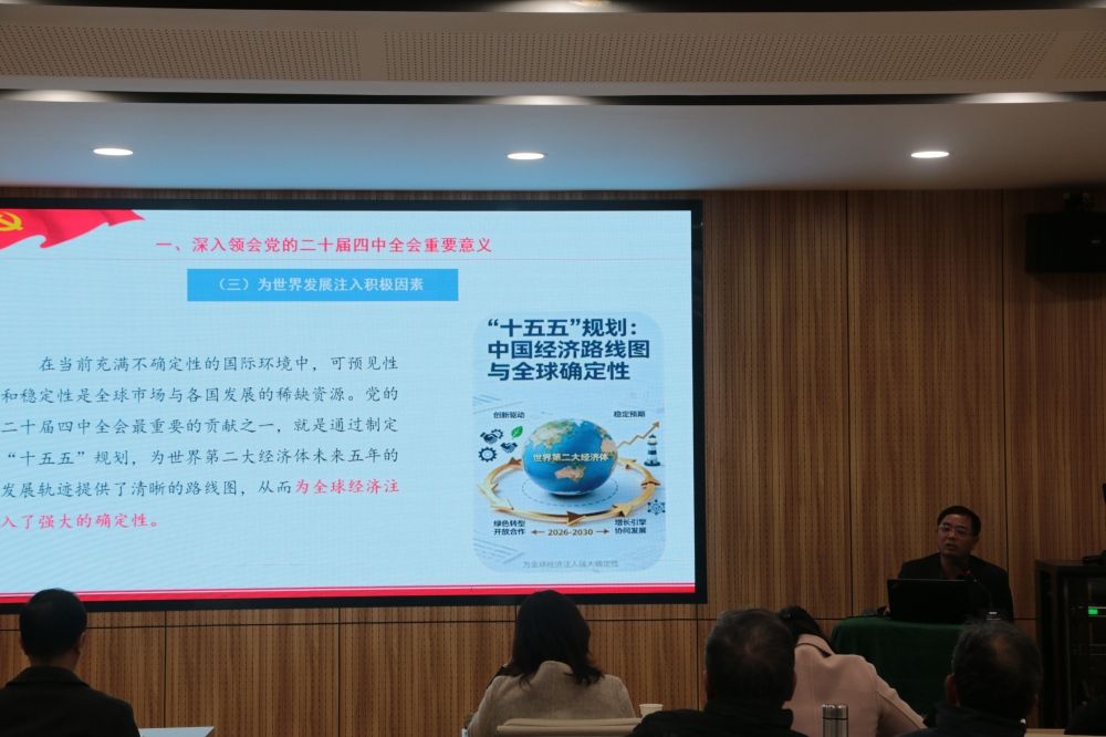 在宣讲过程中,刘勇教授重点分析了全会的承前启后意义,强调"十五五"时期是从"十四五"成就迈向2035年远景目标的关键阶段。他从高质量发展首要任务出发,详细解读了全会提出的现代化产业体系建设、科技自立自强、扩大内需、统筹发展与安全等战略部署,并分析了全会为世界发展注入的确定性与稳定性。刘勇教授还结合湖北省发展实际,传达了省委十二届十一次全会精神,阐述了湖北加快建设中部地区崛起重要战略支点的历史方位、指导思想和重点任务。他强调要将学习贯彻全会精神作为重要政治任务,做到深刻理解、勇于担当、自我革新,切实把宏伟蓝图转化为具体实践。