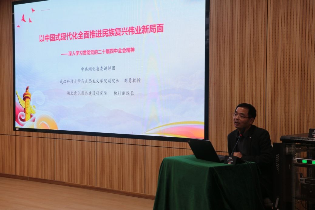 本网讯(通讯员 翁逸豪)12月4日下午,学院在52302报告厅举行学习贯彻党的二十届四中全会精神宣讲会。宣讲会由中共湖北省委讲师团成员、武汉科技大学马克思主义学院副院长、湖北意识形态建设研究院执行副院长刘勇教授主讲。我院领导班子成员、各党支部书记、支部委员、系主任及部分学生党员代表参加了此次活动。